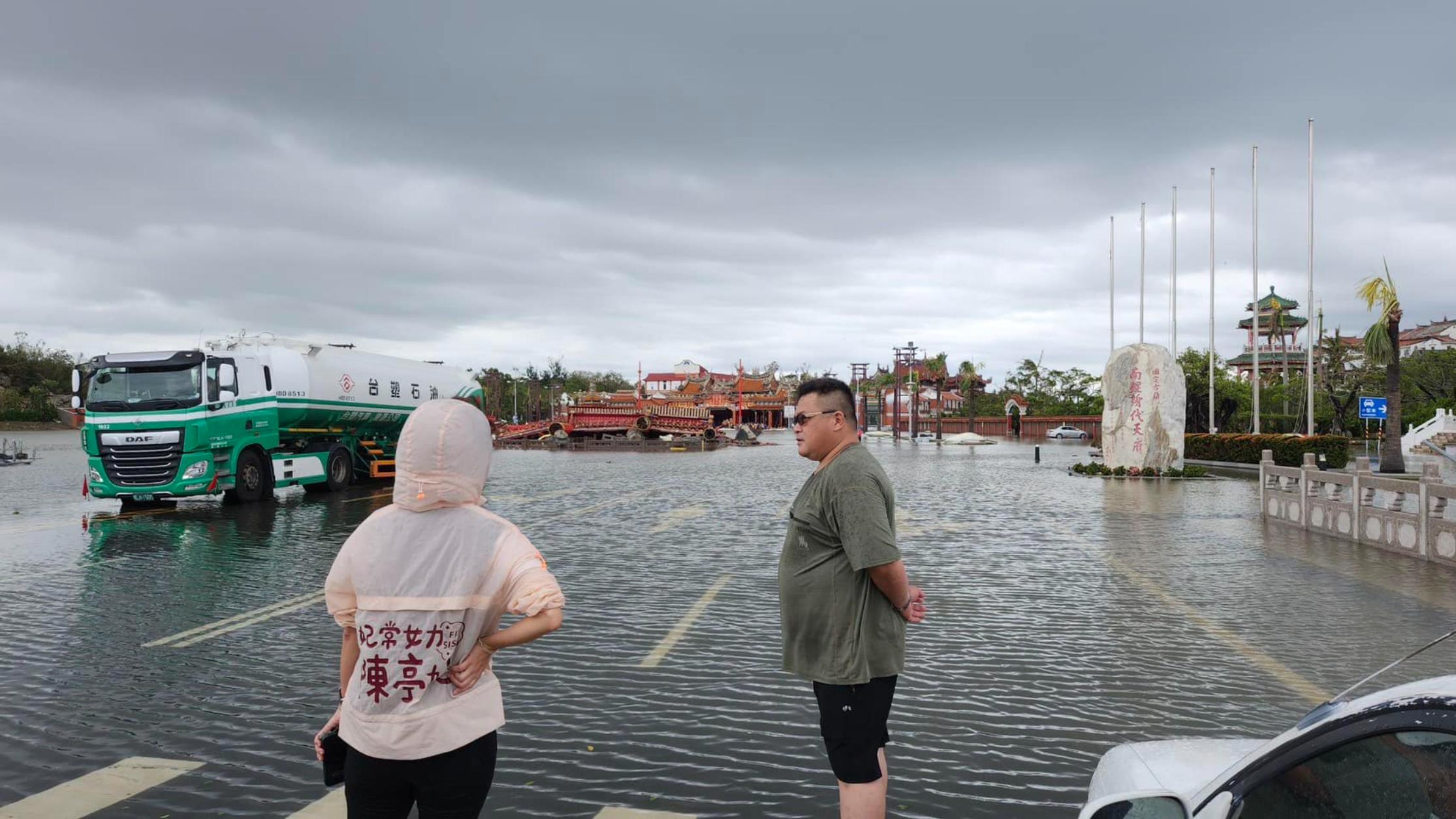 風災過後,南鯤鯓地區的積水尚未完全退去,從廟前廣場延伸至牌樓區域,積水仍深及小腿高度。