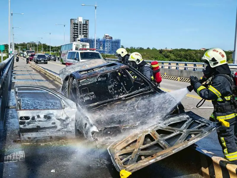 今日下午14時16分,金門大橋發生首起車輛自撞並引發火警事件。一輛自小客車疑似因輪胎爆裂導致車輛失控,滑行後撞上橋中央的分隔設施,隨後車體起火燃燒。所幸車內林姓駕駛與另一名乘客及時逃出,並未造成任何人員傷亡。事故發生後,當地消防單位迅速趕往現場處理,緊急疏導橋面車流並成功撲滅火勢。該車輛在火警中被完全燒毀,詳細肇事原因目前正由相關單位進一步釐清中。