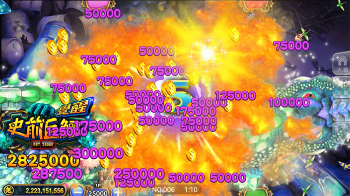 舉個例子來說,假設玩家投注了5元的砲彈並成功擊中10倍分數的魚,那麼他將獲得510=50的分數;若是下注50元,則獲得的分數會是5010=500分。