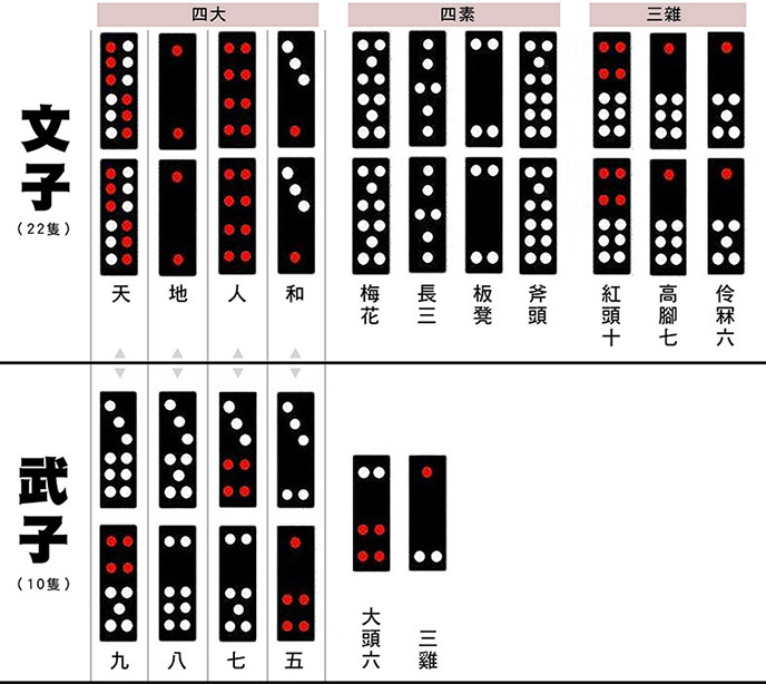 在台灣牌九中,整副牌由22張文牌與10張武牌構成。