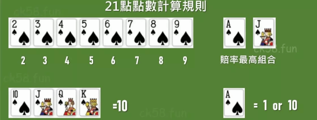 - 在遊戲開始時,若玩家的兩張底牌加總正好是21點,也可直接獲勝。