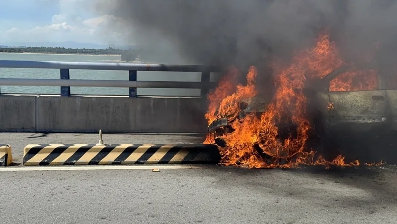 今日下午14時16分,金門大橋發生首起車輛自撞並引發火警事件。一輛自小客車疑似因輪胎爆裂導致車輛失控,滑行後撞上橋中央的分隔設施,隨後車體起火燃燒。所幸車內林姓駕駛與另一名乘客及時逃出,並未造成任何人員傷亡。事故發生後,當地消防單位迅速趕往現場處理,緊急疏導橋面車流並成功撲滅火勢。該車輛在火警中被完全燒毀,詳細肇事原因目前正由相關單位進一步釐清中。